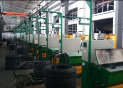 涂層:浸泡皮膜 → 烘干(φ6.5或φ5.5mm的原料) 粗拉: 高架放線 LZ8/600直線式拉絲機組張力架清洗槽 SG740工字輪收線機(φ6.5或φ5.5mm的不銹鋼絲最小拉到φ1.8mm)